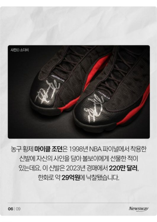 농구 황제 마이클 조던은 1998년 NBA 파이널에서 착용한 신발에 자신의 사인을 담아 볼보이에게 선물한 적이 있는데요. 이 신발은 2023년 경매에서 220만 달러, 한화로 약 29억원에 낙찰됐습니다.