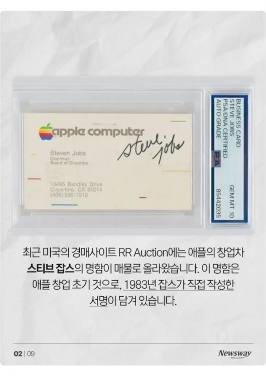 최근 미국의 경매사이트 RR Auction에는 애플의 창업차 스티브 잡스의 명함이 매물로 올라왔습니다. 이 명함은 애플 창업 초기 것으로, 1983년 잡스가 직접 작성한 서명이 담겨 있습니다.