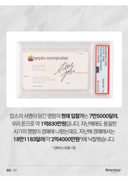 잡스의 서명이 담긴 명함의 현재 입찰가는 7만5000달러, 우리 돈으로 약 1억830만원입니다. 지난해에도 동일한 시기의 명함이 경매에 나왔는데요. 지난해 경매에서는 18만1183달러(약 2억4000만원)에 낙찰됐습니다.
