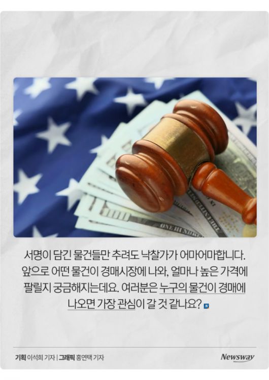 서명이 담긴 물건들만 추려도 낙찰가가 어마어마합니다. 앞으로 어떤 물건이 경매시장에 나와, 얼마나 높은 가격에 팔릴지 궁금해지는데요. 여러분은 누구의 물건이 경매에 나오면 가장 관심이 갈 것 같나요?