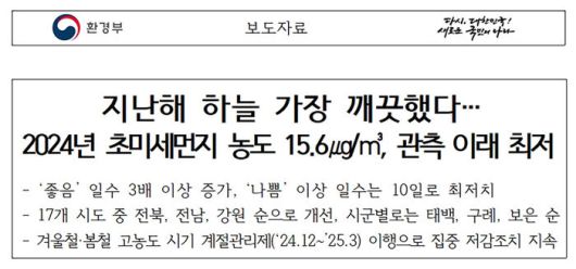 2024년 한국 연평균 초미세먼지 농도 15.6㎍/㎥