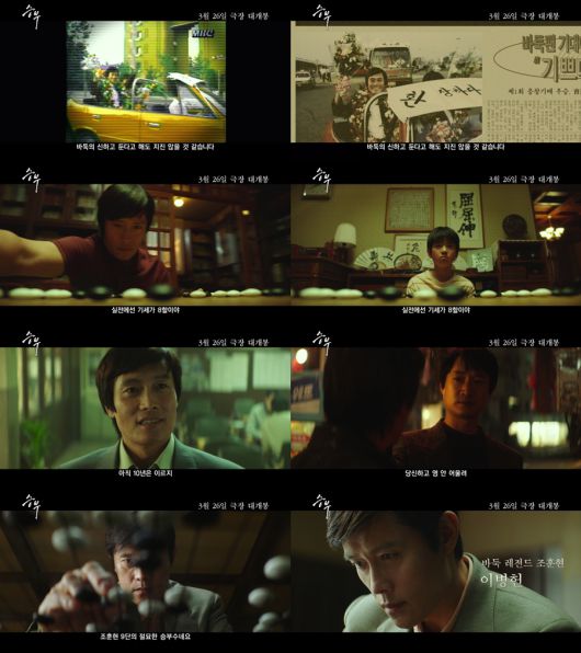 이병헌과 함께 고창석, 현봉식, 문정희, 김강훈까지 연기파 배우들이 예고편에 등장해 영화의 만듦새를 보장한다. 세계 프로바둑 선수권대회 결승에서 우승하며 전국민적 영웅으로 인생 최고의 위치에 서게 된 조훈현(이병헌)이 천재적 감각을 지닌 바둑 신동 이창호(김강훈)를 제자로 받아들이는 과정부터 이후 전설의 라이벌이 된 두 사람의 치열한 대결까지 긴장감 넘치는 전개가 펼쳐진다.
