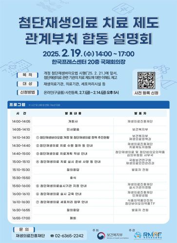 (서울=연합뉴스) 오진송 기자 = 보건복지부는 첨단재생의료 기술을 희귀·난치질환자 치료에 이용하는 '첨단재생의료 치료제도' 시행에 앞서 19일 오후 한국프레스센터에서 관계부처 합동 설명회를 열었다.