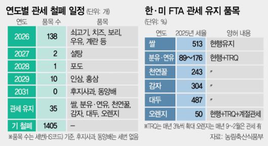 2031년 이후에도 관세가 유지되는 품목은 쌀, 분유·연유, 천연꿀, 감자, 오렌지, 대두 등 35개 품목이다. 2031년 이후에는 이들 품목을 제외한 미국에서 들여오는 농축산물 97.8%가 무관세로 한국에 수입된다.