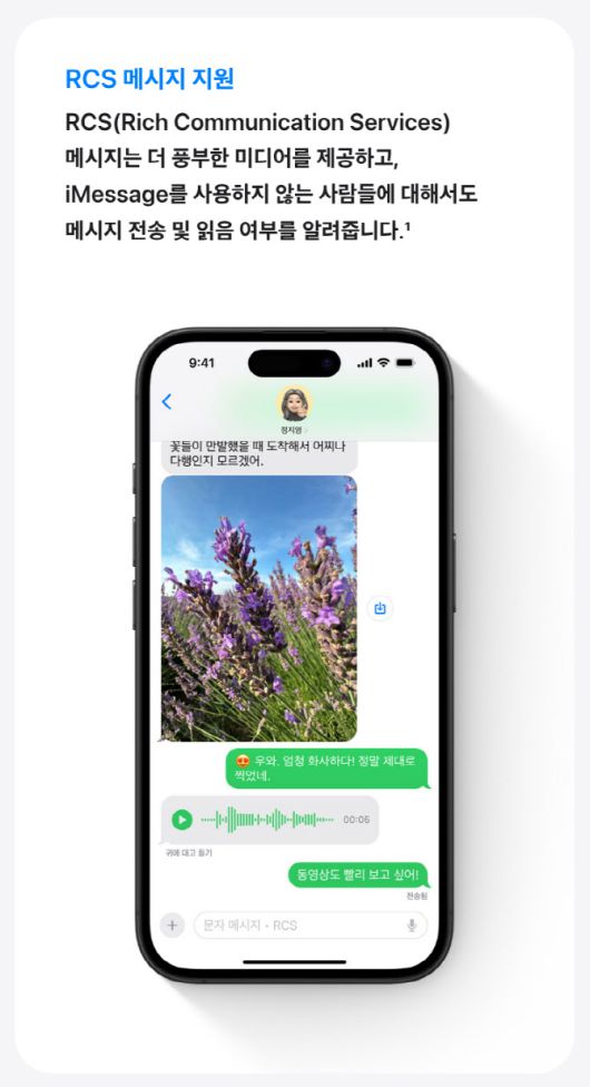 RCS는 이동통신사의 단문 메시지(SMS)나 장문 메시지(MMS)보다 발전된 것으로 대용량 파일 전송이나 ‘작성중’, ‘읽음’ 표시 등 채팅 기능을 지원하는 문자 서비스다. 그동안 한국에서는 갤럭시 스마트폰 이용자끼리만 RCS 방식의 문자·데이터 전송이 가능했다. 애플은 작년 9월 배포한 운영체제(OS) iOS18에 RCS 지원 기능을 포함시켰지만, 한국에선 이용이 불가했다.