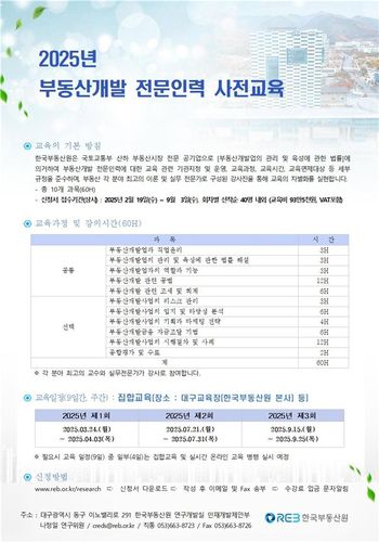 ▲ 한국부동산원은 건축사, 건설기술자, 변호사, 감정평가사 등 부동산 전문 인력의 역량 강화를 돕고자 '2025년 부동산개발 전문인력 교육'을 개설하고 제1회차 교육생을 모집한다고 19일 밝혔다. 교육은 다음 달 24일부터 4월 3일까지 한국부동산원 대구 본사에서 진행한다. 교육 수료자에게는 '부동산개발 전문인력 사전교육' 수료증을 발급한다. 교육 신청은 다음 달 14일까지 전용 전자우편(creds@reb.or.kr)을 통해서 하면 된다. 신청서 양식은 한국부동산연구원(www.reb.or.kr/research)이나 한국부동산원(www.reb.or.kr) 홈페이지에서 내려받을 수 있다. (서울=연합뉴스)