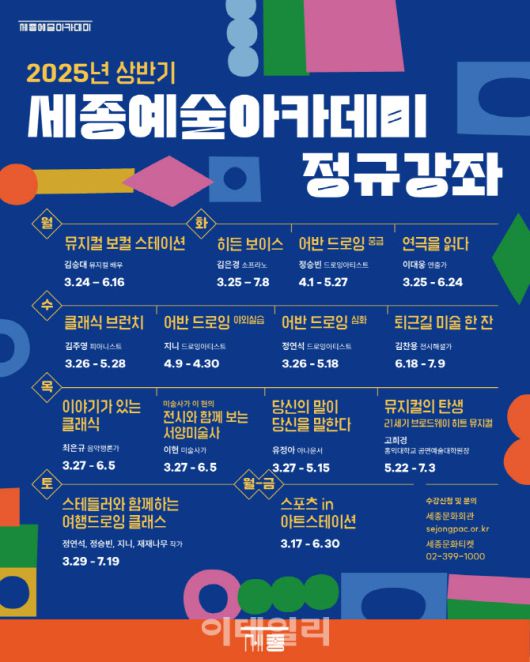 [이데일리 김현식 기자] 세종문화회관은 문화예술 교육 프로그램 ‘세종예술아카데미’를 오는 3월 24일부터 7월 19일까지 진행한다고 19일 밝혔다.
