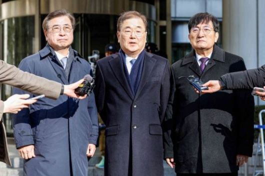 서훈 전 국가정보원장, 정의용 전 국가안보실장, 노영민 전 대통령 비서실장(왼쪽부터)이 19일 서울 서초구 서울중앙지방법원에서 열린 탈북 어민 강제북송 사건에 대한 1심 선고를 마친 뒤 입장 발표를 하고 있다. 이날 재판부는 정의용 전 국가안보실장과 서훈 전 국가정보원장에 징역 10개월의 선고 유예를 선고 했고, 노영민 전 대통령 비서실장에게 징역 6개월의 선고 유예를 선고 했다. 선고유예는 형의 선고를 미루고, 유예일로부터 2년이 지나면 사실상 없던 일로 해주는 판결이다. 2025.2.19. 강진형 기자 |