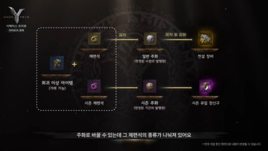 주화는 일반 주화와 시즌 주화로 나뉘며 거래 가능한 희귀 등급 이상 아이템과 제련석을 조합해 만든다. 일반 주화는 전설 장비 제작 및 강화에 사용하며, 시즌 주화는 시즌 유일 장신구 제작에 쓰인다.