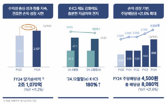 아울러 밸류업(기업가치 제고)와 관련해서는 중기 주주환원율을 50%로 높이겠다고 약속했다. 이 CFO는 “단계적인 주주환원 확대 기조 하에 올해 주당 배당금을 4500원으로 결정했다. 수익개선 노력을 지속함과 동시에 지급여력을 적정하게 유지하면서 주주환원율을 안정적으로 상향시킬 예정”이라며 “우량 배당 성장주로서 시장에서 투자 매력을 제고하고, 회사 가치를 더욱 인정받는 삼성생명을 만들어가겠다”고 강조했다.