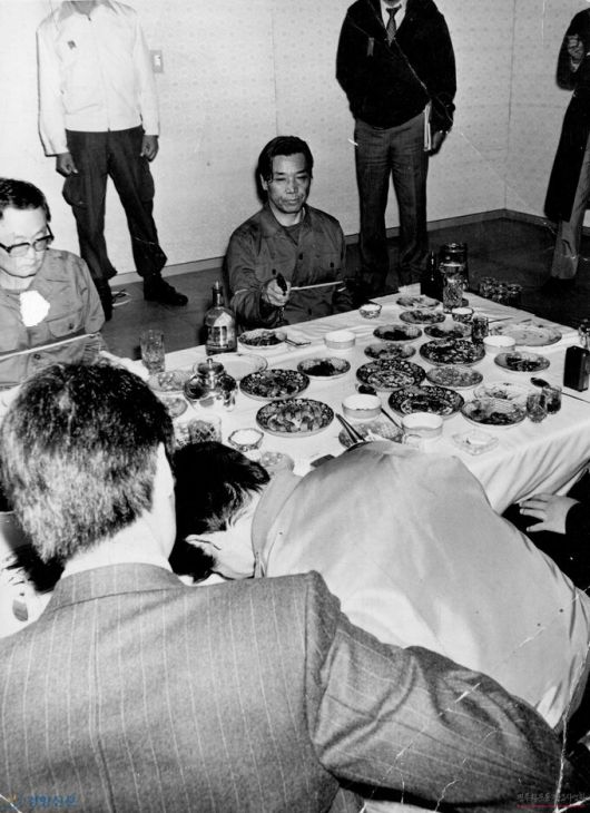 김재규 전 중앙정보부장이 1979년 11월7일 현장검증에서 박정희 대통령을 쏘는 모습을 재연하고 있다. 민주화운동기념사업회 제공 |