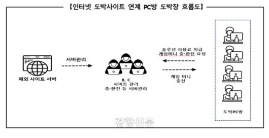 인터넷 도박사이트와 연계한 PC방 불법 도박장 구조도. 서울경찰청 마약범죄수사대 제공 |