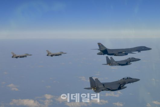 미 B-1B 전략폭격기와 미 F-16, 한국 공군 F-15K가 연합공중훈련을 하고 있다. (사진=국방부) |