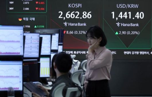 코스피가 연속 상승세를 멈추고 하락 출발한 20일 서울 중구 하나은행 딜링룸 현황판에 코스피 지수와 원/달러 환율 등이 표시되고 있다. 이날 코스피는 전장보다 0.37% 내린 2661.72에 출발했으며 서울 외환시장에서 원/달러 환율은 2원 이상 오르며 강세로 시작했다. 2025.2.20 조용준 기자 |