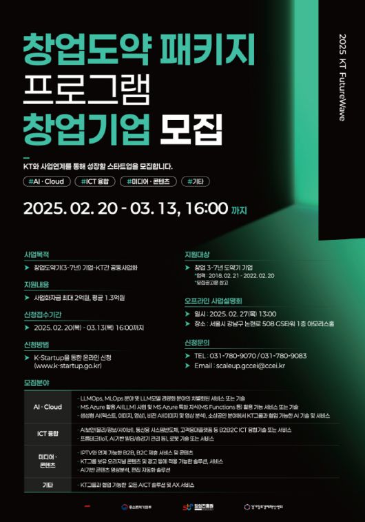 KT 퓨처웨이브 창업도약패키지는 창업 3~7년 차 도약기에 있는 유망 스타트업을 발굴해 KT와 공동으로 협업할 사업 과제를 선정하고 기술검증(POC)과 함께 최종 공동 서비스·사업화를 목표로 하는 기업 스케일업 프로그램이다. KT가 중소벤처기업부, 창업진흥원, 경기창조경제혁신센터와 함께 진행한다. 참가를 원하는 기업은 창업지원포털 'K-스타트업'(www.k-startup.go.kr)에서 신청할 수 있다.