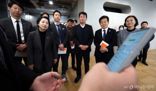 [성남=뉴시스] 추상철 기자 = 국회 과학기술정보통신위원회 소속 의원들이 19일 오전 경기 성남시 분당구 네이버 1784에서 열린 '국내 AI 산업 발전 위한 현장 소통 강화' 현장 방문에서 사내 배송로봇 시스템에 대한 설명을 듣고 있다. 2025.02.19. |