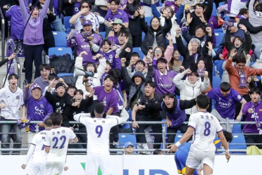 FC안양 팬들이 16일 울산 문수축구경기장에서 열린 K리그1 2025 1라운드 울산 HD와 경기에서 모따의 결승골이 터지자 환호하고 있다. 울산=뉴스1