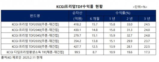 KG제로인에 따르면, KCGI운용의 2023년 말 기준 TDF의 빈티지별 1년 수익률 평균은 13%로 TDF를 운용하고 있는 20개 운용사 중 10위권이었으나, 2024년 말 기준 17.9%로 2위를 기록해 양호한 수익률을 보이고 있다.