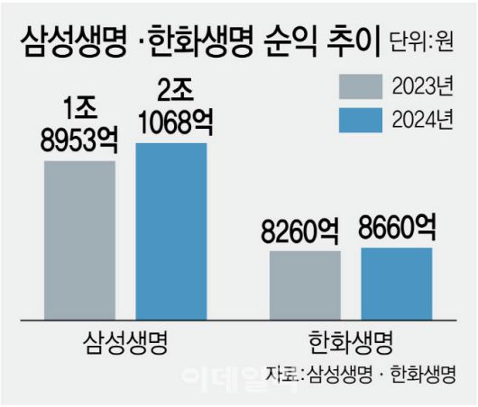 20일 금융권에 따르면 지난해 삼성생명의 순익은 연결 기준 2조 1068억원으로 전년 대비 11.2% 증가했다. 한화생명도 전년 대비 8660억원을 기록해 전년(8260억원) 대비 4.8% 증가했다.