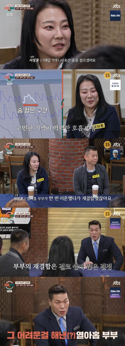 서장훈은 "아내분의 결과는 거짓이 나왔다. 10초간 숨을 참았다고 하는데 그건 고민을 많이 한 흔적"이라며 "두 분은 한 번 이혼했다가 재결합했다. 천생연분이다.