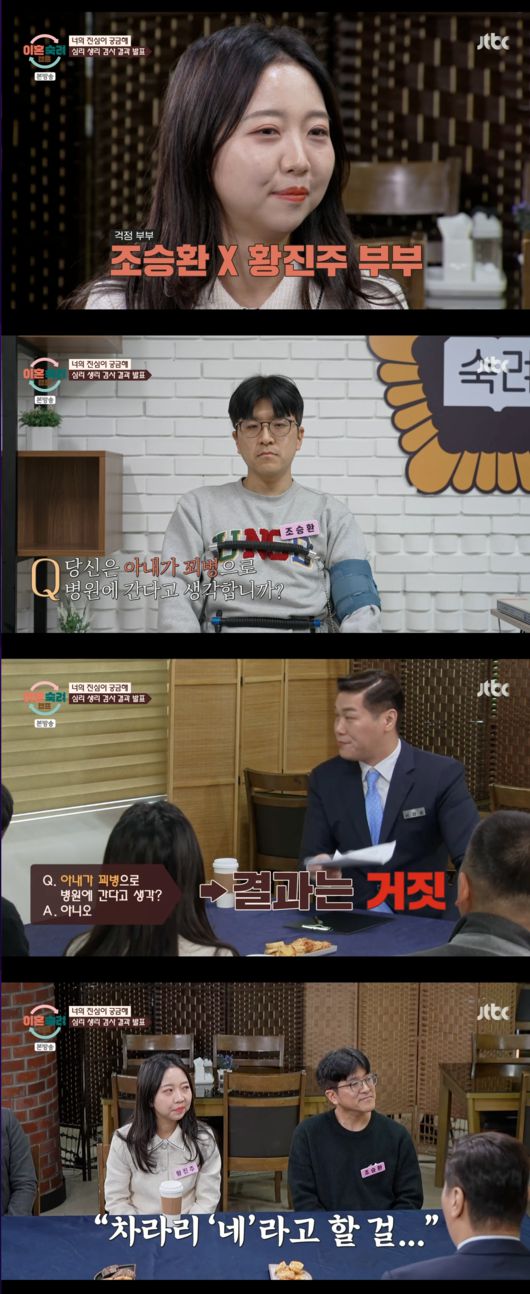 부부의 심리 생리 검사 결과가 발표됐다. 걱정부부인 조승환, 황진주 부부의 결과가 먼저 공개됐다. 남편은 ‘당신은 아내가 꾀병으로 병원에 간다고 생각합니까?’라는 질문에 “아니오”라고 답을 했다. 결과는 거짓으로 나왔다고.