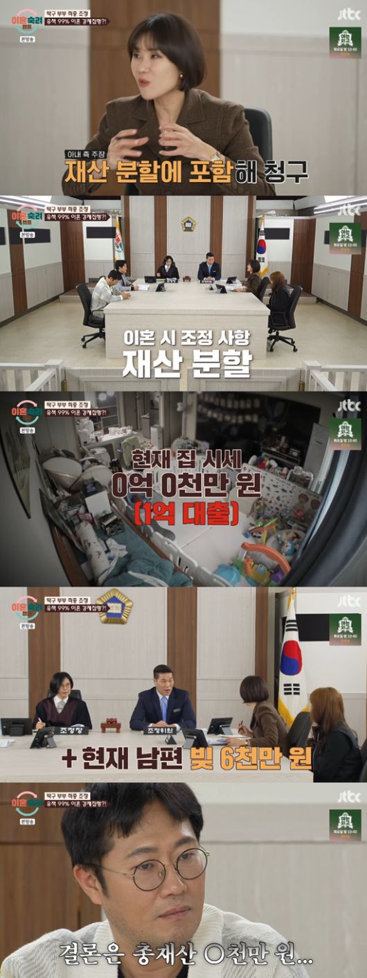 이날 '탁구 부부' 양측은 재산분할 조정을 했다. 양나래 변호사는 "총 재산 중 1억 대출을 받았고 남편 분의 개인 빚이 6천이 있다"며 "결혼 생활하며 남편 분이 경제 활동을 전혀 하지 않았다"고 분할한 재산이 0원이라고 했다.