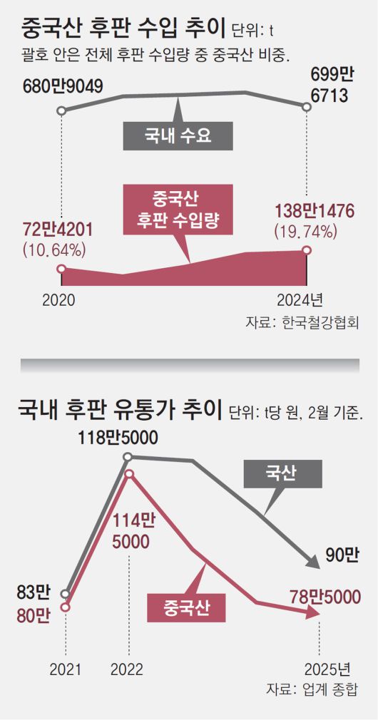 두꺼운 철판인 후판은 주로 선박 건조에 사용되며 일부는 H형강 등으로 가공되어 건설 산업에도 쓰인다. 후판 물량의 절반 이상을 소화하는 국내 조선업계가 수주 호황을 누리고 있지만 값싼 중국산 후판을 선호하는 경향이 강해지면서 국내 철강업계의 어려움은 가중돼 왔다. 한국철강협회에 따르면 국내 후판 유통 물량에서 중국산이 차지하는 비중은 2022년 10.9%에서 지난해 19.7%로 높아졌다.