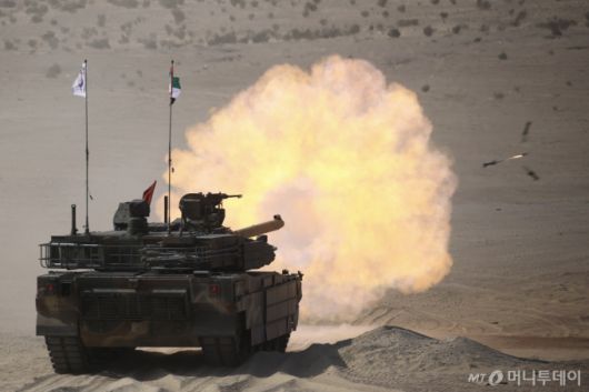 육군은 지난 10일부터 20일까지 ‘2025년 아랍에미리트(UAE) 연합훈련 TF’가 UAE군과의 현지 연합훈련을 성공적으로 마치고 귀국길에 오른다고 21일 밝혔다. 현지연합훈련단 소속 K2전차가 연합사격 훈련간 표적을 향해 120mm 전차포를 사격하고 있다. / 사진=육군 |