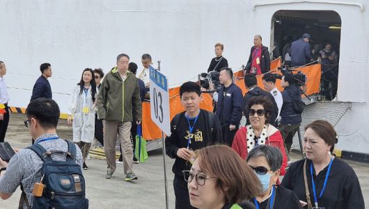 지난해 중국 노동절 연휴를 보내기 위해 제주항에 도착한 중국발 크루즈 드림호를 타고 온 중국인 관광객이 크루즈선에서 걸어 나오며 환하게 웃고 있다. 연합뉴스 |