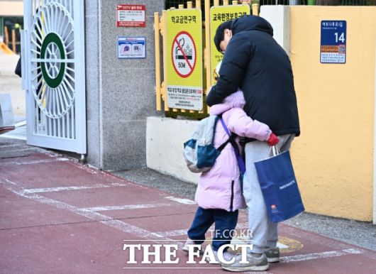 교사노조연맹은 지난 20일 현재 입법예고된 가칭 하늘이법에 대한 의견 긴급 온라인 설문조사 결과를 공개했다. 사진은 울 영등포구의 한 초등학교 앞에서 한 아버지가 자녀와 포옹하는 모습. / 이새롬 기자 |