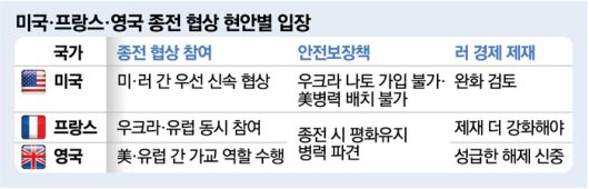 마크롱 대통령은 지난 17일과 19일 엘리제궁에 유럽 각국 정상과 북대서양조약기구(NATO·나토) 동맹국인 캐나다의 쥐스탱 트뤼도 총리를 초청해 우크라이나와 유럽의 안보 보장을 위한 의견을 수렴했다. 내주 워싱턴DC에서 있을 회담에서 트럼프 대통령이 종전 협상에서 배제될 걱정을 하는 유럽의 의견을 경청할지는 의문이다.