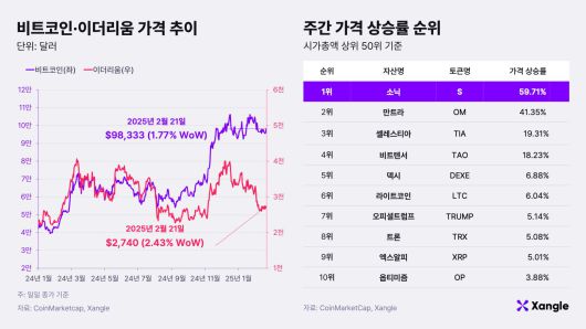 비트코인·이더리움 가격 추이와 주간 가격 상승률 순위(21일 기준) /쟁글 제공 |