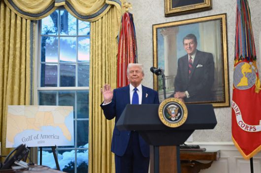 도널드 트럼프 미국 대통령이 지난 11일 백악관 오벌오피스에서 열린 털시 개버드 국가정보국장 취임 선서 행사 직전 발언하고 있다. 트럼프 왼쪽엔 멕시코만을 아메리카만으로 표기한 지도, 오른쪽엔 아메리카 대륙이 그려진 미 해병대 깃발이 전시돼 있다. AFP=연합뉴스 |