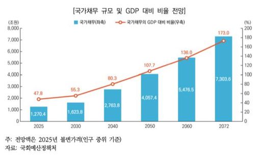 전망을 보면 국가채무의 GDP 대비 비율은 올해 47.8%에서 2040년 80.3%, 2050년 107.7%, 2060년 136.0%, 2072년 173.0%로 가파르게 증가한다.