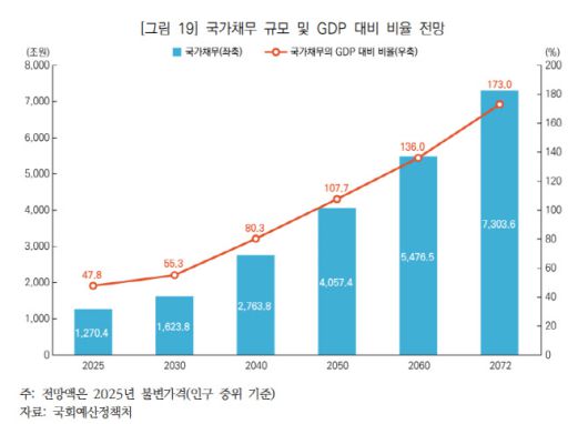 이에 따른 국가채무는 2025년 1270조 4000억원에서 2072년 7303조 6000억원으로 6배 가량 폭증할 전망이다. 국가채무가 연평균 3.8% 증가하는 셈이다. GDP 대비 국가채무 비율도 빠르게 증가할 전망이다. 현재 47.8%에서 2050년(107.7%) 100%를 넘어서고, 2072년에는 173.0%에 달할 것으로 내다봤다.
