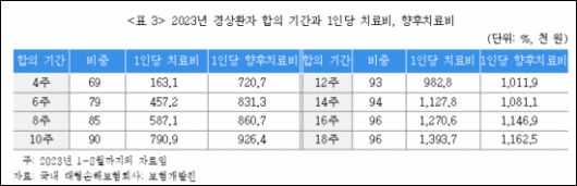 보험연구원이 경상환자의 합의 기간과 1인당 향후치료비를 분석한 결과 합의 기간이 길수록 향후치료비는 커졌다. 경상환자가 4주 이내에 합의하면 1인당 향후치료비는 72만원이다. 8주 이내에 합의하면 86만원, 12주는 101만원, 18주는 116만원이었다. 경상환자가 병상에 장기간 드러누워 높은 향후치료비를 유도한 결과다. 전용식 보험연구원 선임연구위원은 "경상환자에 대한 향후치료비는 실손보상의 원칙에 위배된다"면서 "주로 합의를 목적으로 하고 있어 발생하지 않는 손해를 보상하는 경향이 있기 때문"이라고 지적했다.