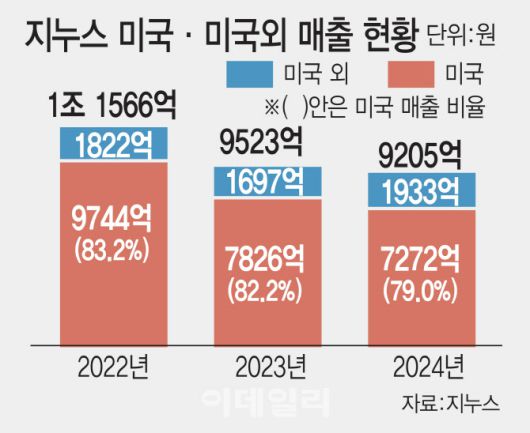 이번 조치는 지누스에 호재다. 지누스 인도네시아 공장은 생산규모가 가장 큰 공장이어서다. 이곳에서 생산한 매트리스는 미국 물량의 대부분을 소화한다. 지누스는 현대백화점그룹에 피인수된 이후 글로벌 수출국 확대에 나서고 있지만 미국 시장의 매출액 비중은 △2022년 83.2% △2023년 82.2% △2024년 79%로 여전히 높은 편이다.
