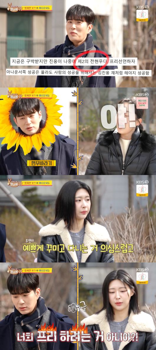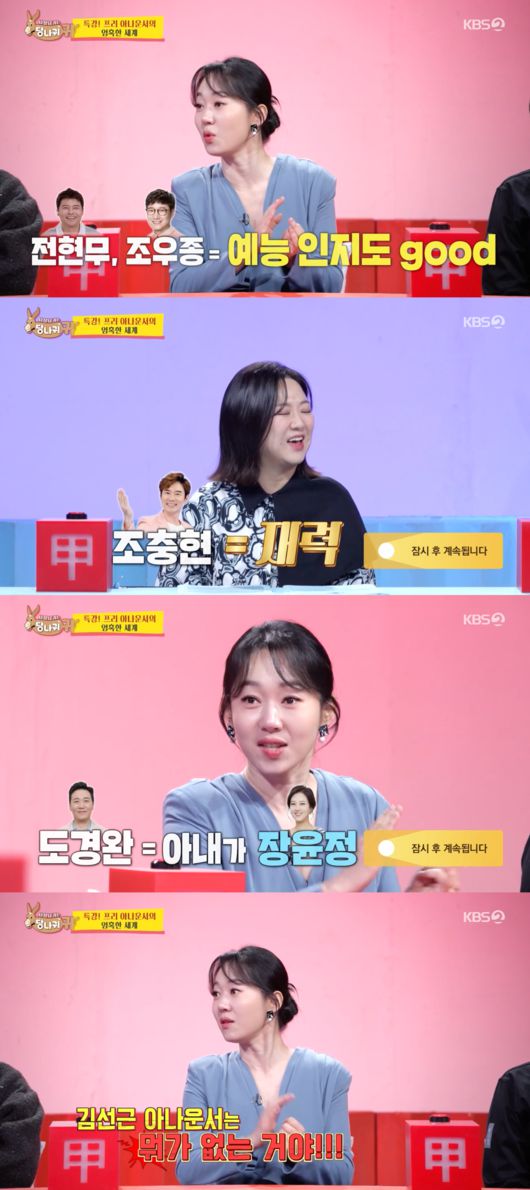 23일 방송된 KBS2 ‘사장님 귀는 당나귀 귀’에서는 엄지인 아나운서가 후배 김진웅, 홍주연과 함께 프리 아나운서를 만나는 모습이 포착됐다.