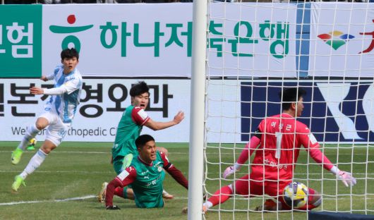 23일 K리그 울산과 대전 경기에서 울산 윤재석(가장 왼쪽)이 때린 슈팅이 대전 골대 안으로 들어가고 있다. /연합뉴스 |