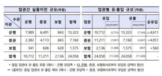 이어 은행→증권사(6491억원), 증권사→증권사(4,113억원) 등 순으로 이동 규모가 컸다.
