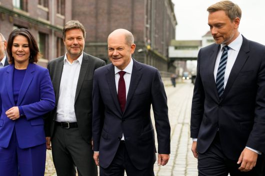2021년 3당 연립정부 출범 당시 독일 녹색당 아날레나 베어복·로베르트 하벡 공동대표, 올라프 숄츠 사회민주당 총리 후보, 크리스티안 린트너 자유민주당 대표.(왼쪽부터) /AP 연합뉴스 |