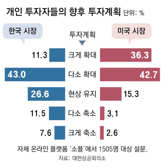 향후 미국 시장에 투자를 ‘확대할 의향’이 있는 응답자는 79.0%인 반면, 국내 시장 투자를 확대하겠다는 응답률은 54.3%에 그쳤다. 국내 시장 투자를 축소하겠다는 응답률은 19.1%였는데 미국 투자를 줄이겠다는 응답률은 5.7%였다.