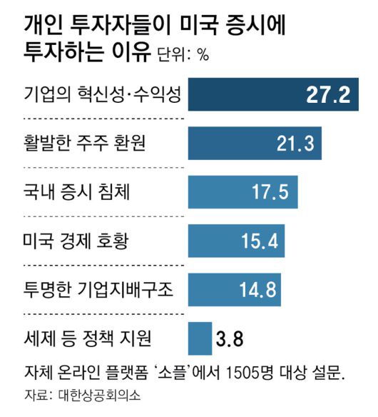 미국 투자를 선호하는 이유는 ‘기업의 혁신성·수익성’(27.2%)이 꼽혔다. ‘활발한 주주 환원’(21.3%), ‘국내 증시 침체’(17.5%), ‘미국 경제 호황’(15.4%), ‘투명한 기업 지배구조’(14.8%) 등이 뒤를 이었다.