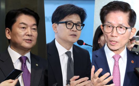 왼쪽부터 안철수 국민의힘 의원, 한동훈 전 국민의힘 대표, 김문수 고용노동부 장관. (사진 = 연합뉴스) |