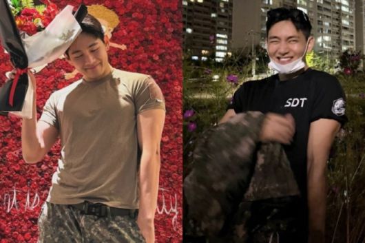 사진 속에는 꽃다발을 들고 포즈를 취하고 있는 모습이 담겼다. 상남자 비주얼관 상반되는 환한 꽃미남 미소도 담겼다. 입대 전 벌크업을 선언하고 24kg을 증량한 만큼 늠름한 몸짱 비주얼이 눈길을 끈다.