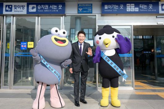 지난 1월 노관규 순천시장이 루미뚱이와 함께 순천역에서 귀성객 환영행사에 참여했다. ⓒ 순천시 |