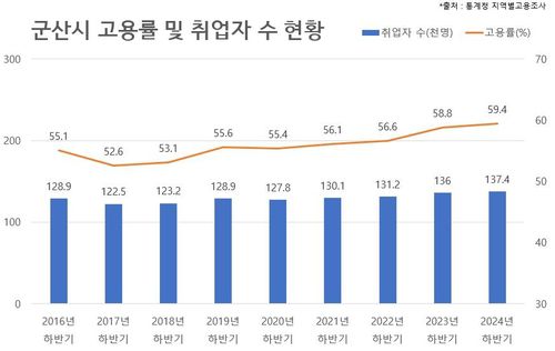 24일 군산시는 통계청이 발표한 '2024년 하반기 지역별 고용조사'에서 2024년 군산시 고용률이 59.4%로 나타났다면서, 이는 전년 동기 대비 0.6% 포인트(p) 증가한 것이라고 밝혔다.