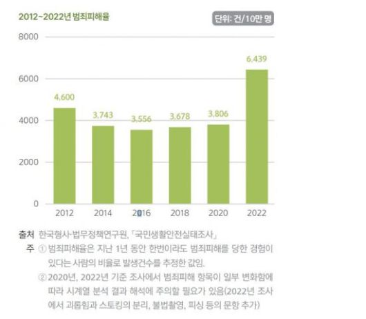 범죄 피해 문제도 심각해진 것으로 나타났다. 범죄피해율은 2022년 인구 10만명당 6439건으로, 2020년(3806건) 대비 급격히 증가했다. 범죄피해율은 관련 통계 집계 이후 가장 크게 증가했는데 이에 대해 통계청은 "2022년 조사에서 괴롭힘과 스토킹의 항목이 분리되고, 불법촬영과 보이스피싱 등의 항목이 추가되면서 범죄피해율 증가에 영향을 미친 것으로 보인다"고 분석했다.