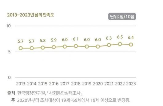 24일 통계청이 발표한 '국민 삶의 질 2024 보고서'에 따르면 한국인의 삶 만족도는 2021~2023년 평균 6.06점으로 OECD 평균(6.69점)을 크게 밑돌았다. OECD 회원국 38개국 가운데 33위다. 한국보다 삶의 만족도가 낮은 곳은 포르투갈, 헝가리, 그리스, 콜롬비아, 튀르키예 등이었다. 핀란드가 7.74점으로 가장 높았다. 삶의 만족도는 객관적 삶의 조건에 대한 개인들의 주관적 만족 정도를 보여주는 지표로 0~10점으로 측정한다.