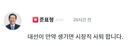 홍준표 대구시장이 대선 출마시 시장직을 사퇴하겠다고 밝혔다. 홍 시장은 24일 자신의 온라인 소통채널 '청년의꿈'의 청문홍답(청년의 고민에 홍준표가 답하다)에서 '조기 대선이든 정상 대선이든 시장직에 계셔야 좋다고 봅니다'라는 글에 "대선이 만약 생기면 시장직 사퇴합니다"라고 답했다.